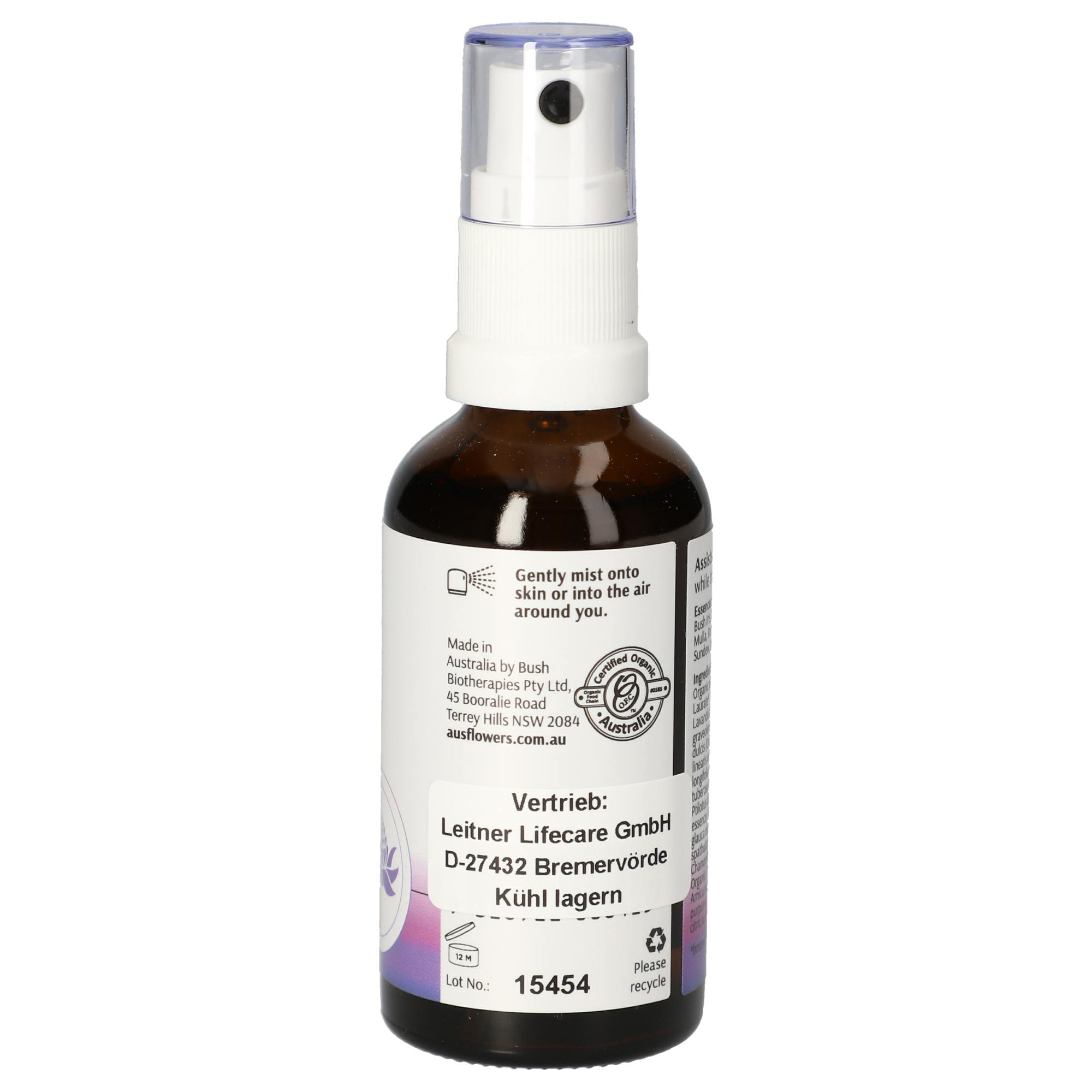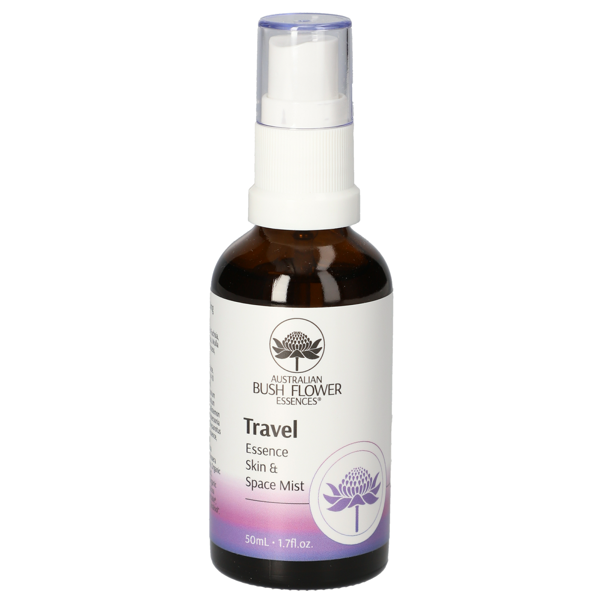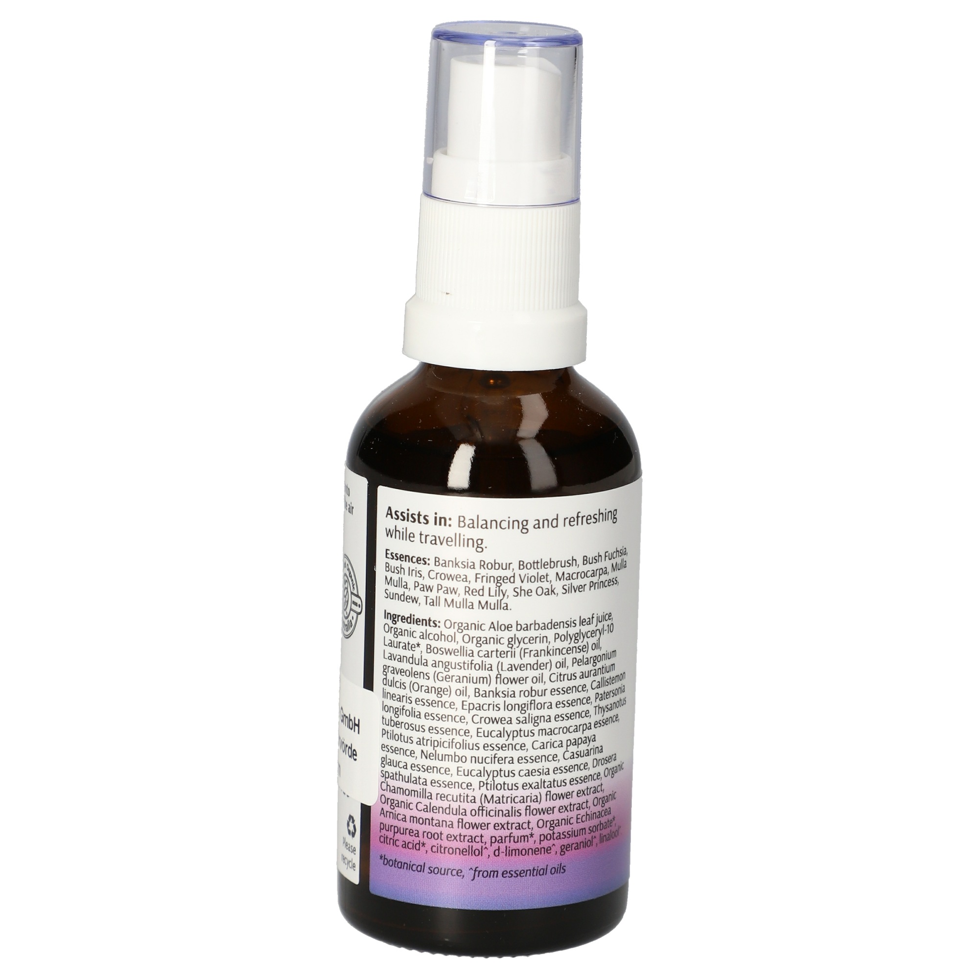 Organic Aloe barbadensis leaf juice, Organic alcohol, Organic glycerin, Boswellia carterii (Frankincense) oil, Lavandula angustifolia (Lavender) oil, Pelargonium graveolens (Geranium) flower oil, Citrus aurantium dulcis (Orange) oil, Banksia robur essence, Callistemon linearis essence, Epacris longiflora essence, Patersonia longifolia essence, Crowea saligna essence, Thysanotus tuberosus essence, Eucalyptus macrocarpa essence, Ptilotus atripicifolius essence, Carica papaya essence, Nelumbo nucifera essence, Casuarina glauca essence, Eucalyptus caesia essence, Drosera spathulata essence, Ptilotus exaltatus essence, Organic Chamomilla recutita (Matricaria) flower extract, Organic Calendula officinalis flower extract, Organic Arnica montana flower extract, Organic Echinacea purpurea root extract.